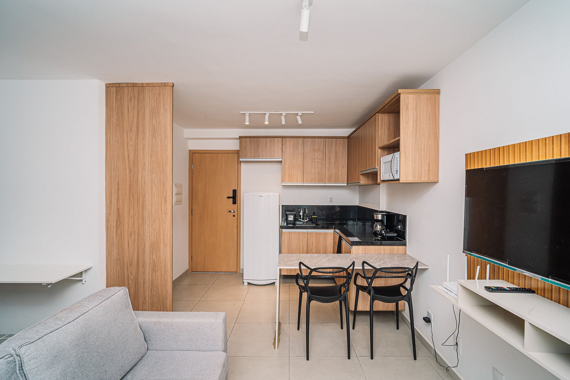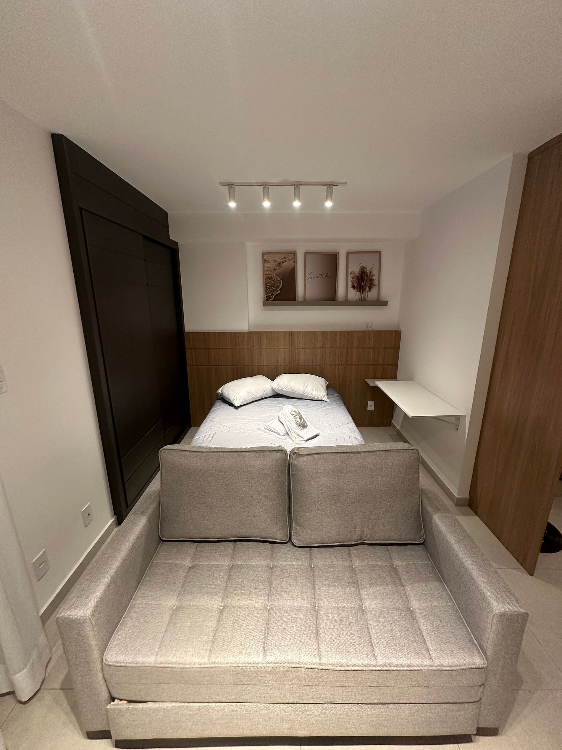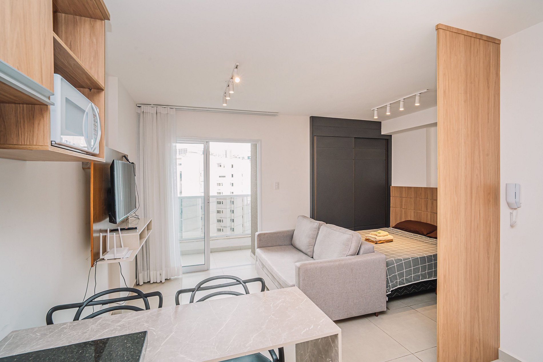 Curta uma experiência elegante neste lugar bem localizado, próximo a supermercados, academias, bancos, padarias e farmácias. Estacionamento no local pago a parte Studio equipado com móveis planejados Italínea no estilo Premium, com roupeiro, coz, sala e bnh. Área de lazer com piscina e churrasq. Lavanderia OMO Wifi Smartv 42 tubo gir qto/sala Fechadura digital Cooktop 2 bc Forno Microondas Geladeira Sanduicheira Liquidificador Sofá Colchão de Espuma tecido fibra bambu