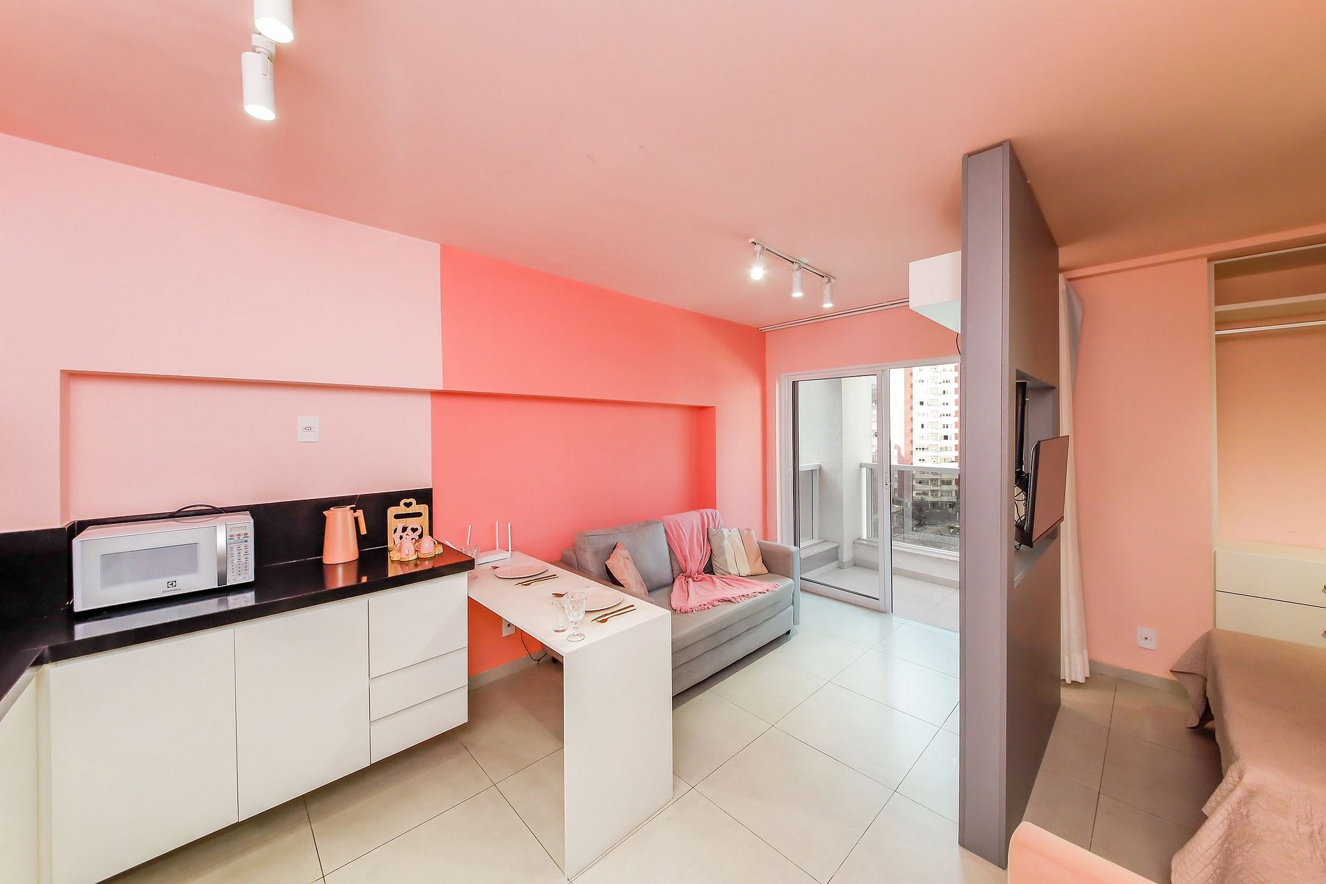 Estúdio temático todo decorado em rosa, inspirado na força e personalidade da mulher. O espaço conta com quadros feministas, penteadeira, cozinha completa e uma charmosa varanda. O prédio oferece diversas comodidades: piscina, academia, área gourmet, espaço pet e garagem. Perfeito para quem busca conforto e estilo em um ambiente acolhedor e cheio de personalidade.
