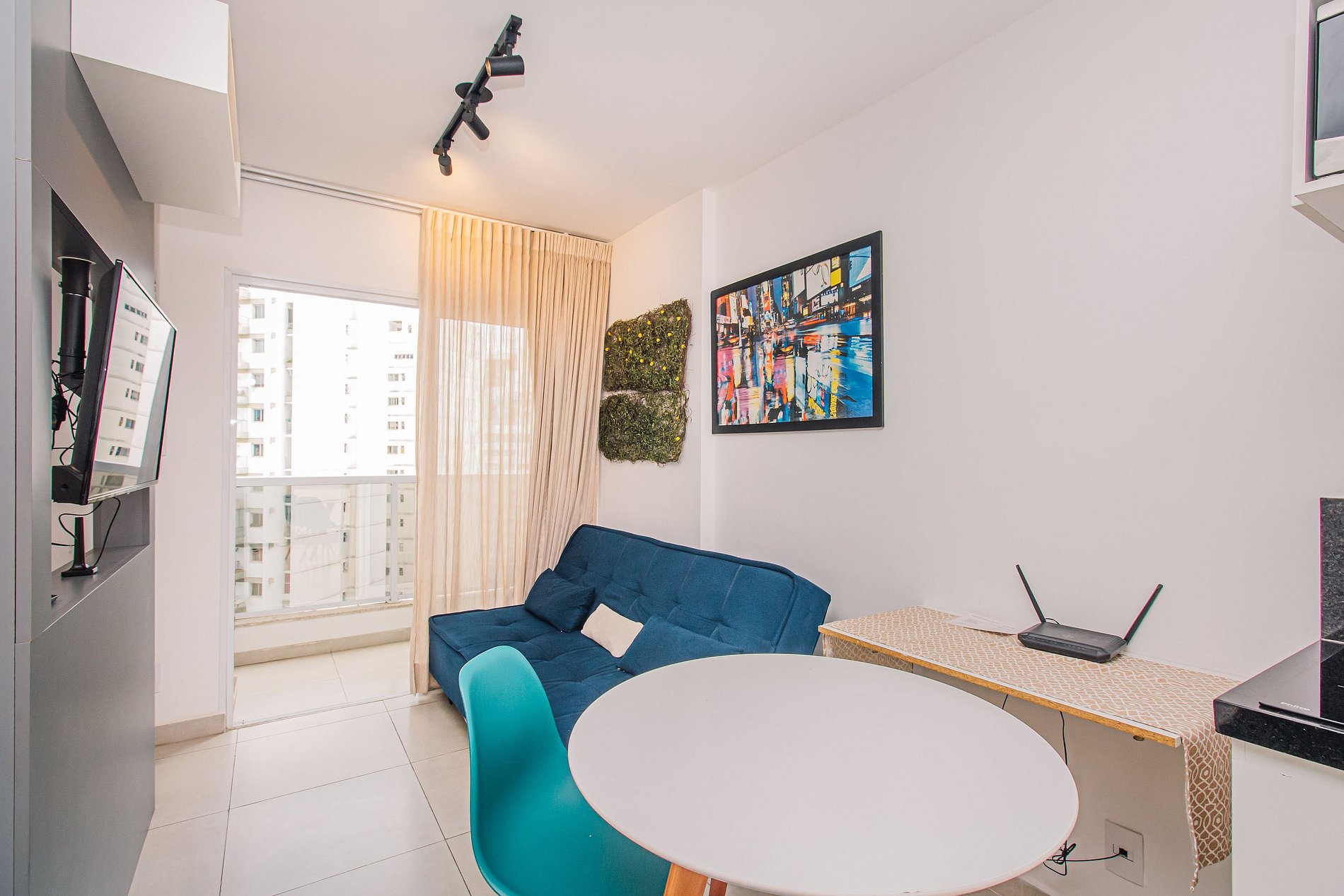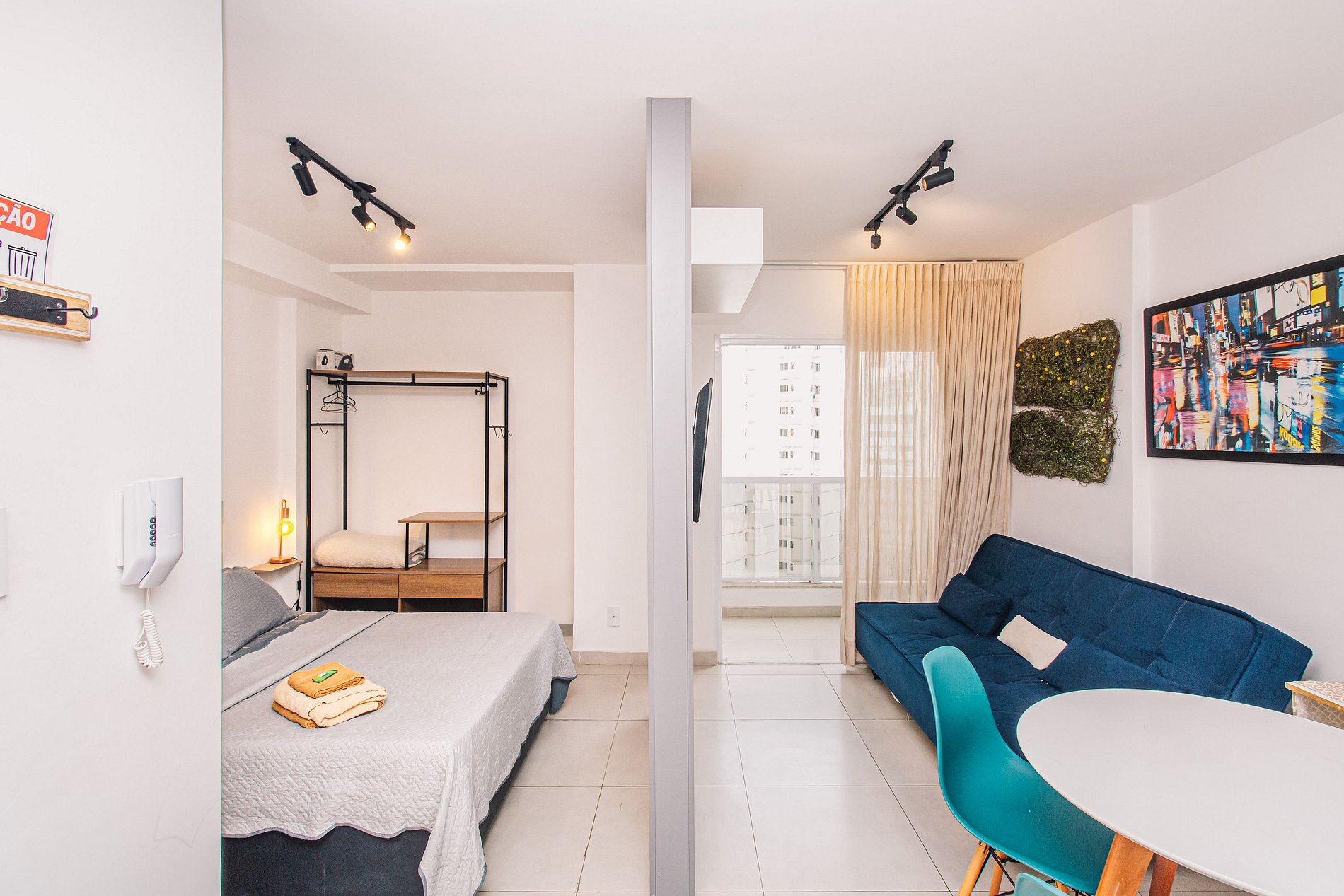 Studio com decoração “estilo Nova Iorque” pensado para curtas ou longas estadia. Pensado para casais, pessoas viajando a lazer/trabalho ou famílias com um filho. Estrutura para até 4 pessoas. Apê no coração de Juiz de Fora, a 5 minutos a pé do Parque Halfed e Rua Halfeld. Supermercados, farmácias, padarias, bares e restaurantes MTO próximos do apartamento, permitindo ir a pé nos tipos de negócio mencionados acima. Academia de ginástica do prédio e uma academia de ginástica completa debaixo do prédio de alto padrão, chamada Dynamo. Smart Fit tb muito próximo, 1 minuto a pé. Espaço apropriado e ergonômico para trabalhar (mesa e pontos de tomada próximo). Internet de qualidade. Cozinha montada com cooktop, geladeira, microondas, liquidificador, utensílios para cozinhar, pratos, copos e talheres. Banheiro com secador de cabelo e espelho. Quarto com roupeiro, colchão novo e televisão de 43”. Sala com sofá cama confortável e tv (tv giratória. Mesa com 4 cadeiras.