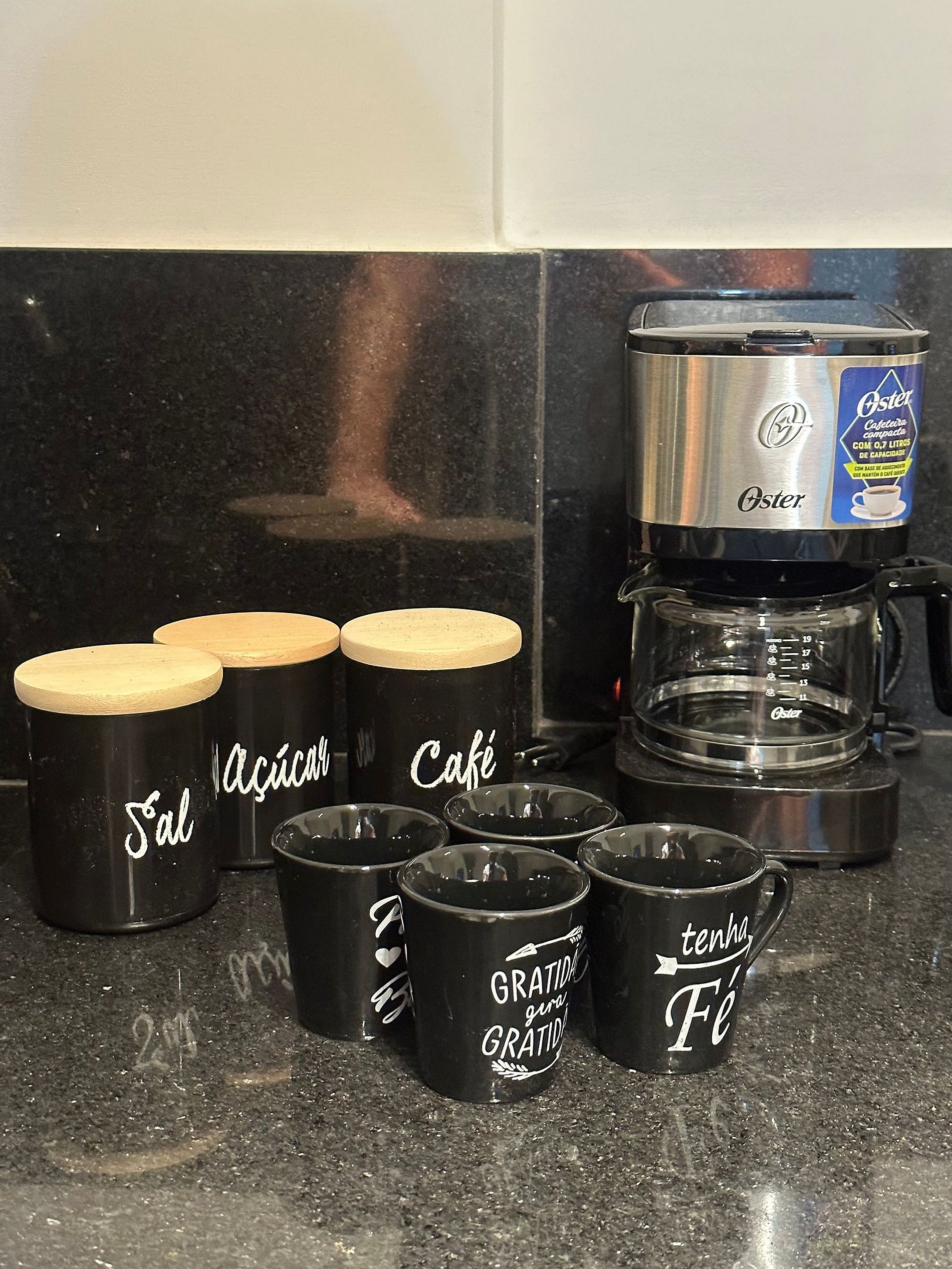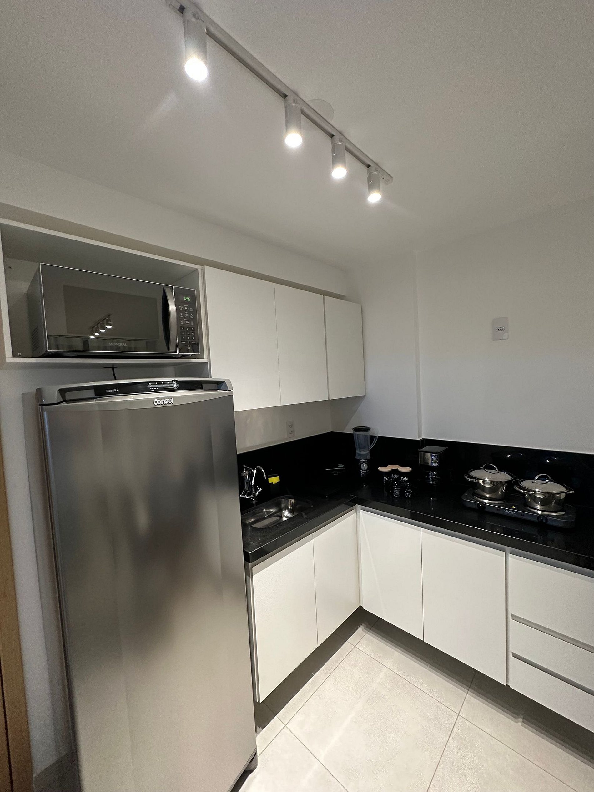 apartamento mobiliado e equipado com cozinha completa, fogão, sanduicheira, liquidifcador, cafeteira, taças, copos, xícaras, pratos, talheres, geladeira e microondas.